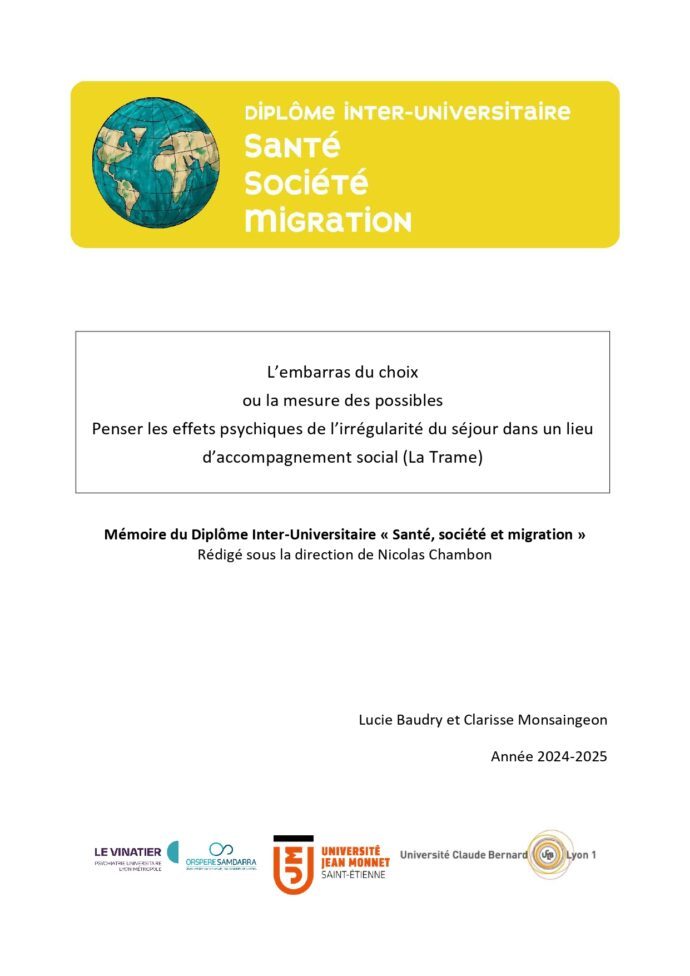 À partir d’entretiens menés avec cinq personnes usagères du dispositif la Trame autour de la question du choix, dans ce contexte très contraint et au-delà du (non) droit se dégagent des pistes de réflexion, des possibilités d’agir et des façons de s’affirmer en tant que sujets et acteurs participants d’une communauté donnée.