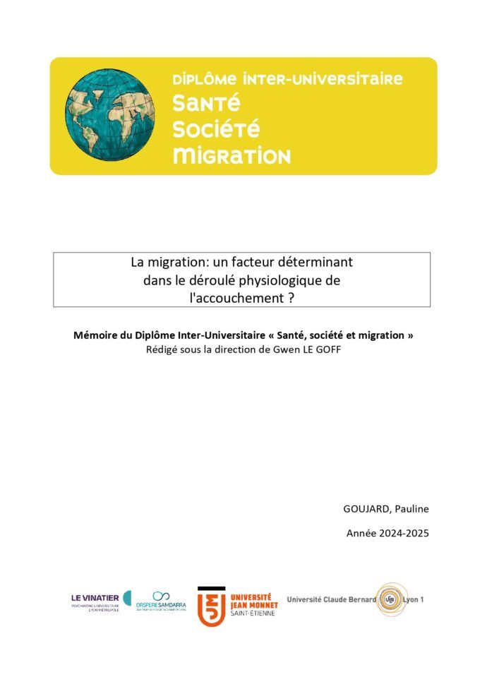 Sage-Femme, depuis plusieurs années, j’exerce à l’hôpital Femme-Mère-Enfant, en périphérie de LYON, CHU de Niveau 3. L’équipe médicale est amenée à accompagner de plus en plus de femmes, ayant vécu des parcours migratoires. Ces parcours sont très souvent complexes. Ces femmes sont dans des situations d’extrême précarité, peuvent avoir vécu ou vivre, des violences multiples et sont pour certaines d’entre elles allophones. L’impact de l’environnement socio-économique et psychique des patientes sur le déroulé de la grossesse et de l’accouchement, est de plus en plus pris en compte dans nos suivis en périnatalité. Je me suis alors posé la question suivante: La migration est-elle un facteur déterminant dans la physiologie de l’accouchement ? Notre suivi et nos prises en charge sont-ils adaptés à ces patientes? Mon hypothèse est que les parturientes issues de l’immigration ont plus de complications lors de leurs accouchements. L’objet de ce mémoire est donc d’établir un état des lieux des accouchements des patientes issues de l’immigration ainsi que des patientes françaises au sein de notre structure, entre 2020 à 2024. Nous rechercherons s’il existe des différences en termes de modalités d’accouchement et de complications. Dans une dernière partie, nous discuterons des éventuelles difficultés, pouvant survenir dans le suivi et la prise en charge de ces femmes. Nous aborderons enfin, quelques pistes de réflexions, ainsi que certains outils et stratégies établis par l’équipe de l’Hôpital Femme Mère Enfant, aidant et soutenant l’accompagnement de ces femmes.